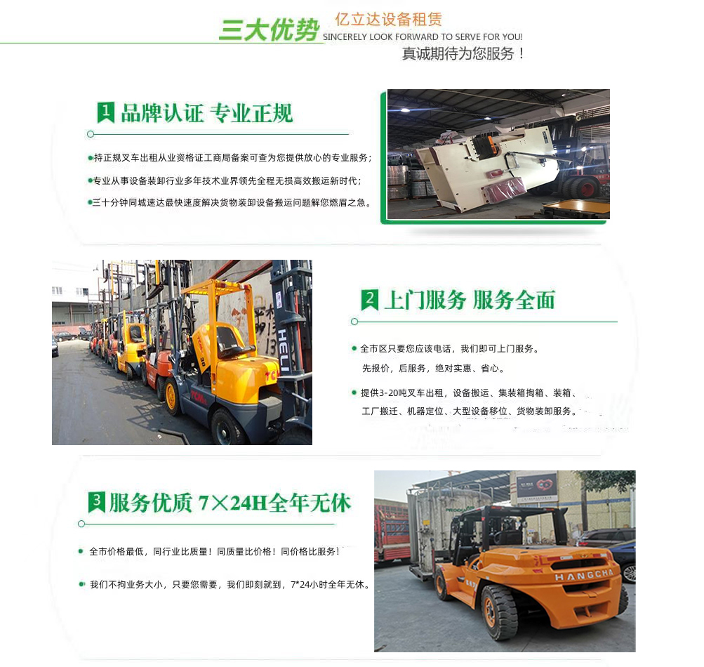 亿立达设备租赁有限公司是工商局准许的北京建筑大学专业叉车出租公司,公司本着诚信、服务、效率、创新的经营理念,用精湛的技术,真诚的服务,为众多客户提供优质的服务,同时获得信赖与支持。专业提供北京建筑大学3-20吨叉车出租、叉车租赁、设备搬运、集装箱掏箱装箱、机器移位定位、货物装卸、工厂搬迁、安全可靠,收费透明,价格便宜,随叫随到,24小时上门服务!本公司叉车吊车师傅对各种设备搬运装卸都有深刻探讨和研究。很多的疑难设备搬运,通过我公司的叉车师傅都能迎刃而解。对各种进口设备、国产机器、大型设备搬迁、高难度搬迁、各种精密仪器、医疗设备、科研设备等都能搬运; 提供全市 24 小时上门装卸搬运服务。同时提供厂房搬迁服务。 ...